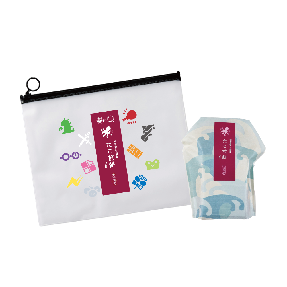 原材料:でん粉(国内製造)、たこ、砂糖、えび、しょうゆ、食塩、果糖ぶどう糖液糖、植物油脂、水飴、米粉(うるち米(国産))、鰹節エキス、酵母エキス、みりん、鰹節、昆布エキス、香辛料、醸造酢、ガーリックパウダー、昆布、煮干、椎茸/調味料(アミノ酸等)、酸化防止剤(抽出V.E)、着色料(紅麹、アカビート、カロチノイド)、膨張剤、甘味料(ステビア、スクラロース)、(一部にえび・小麦・大豆・さばを含む)